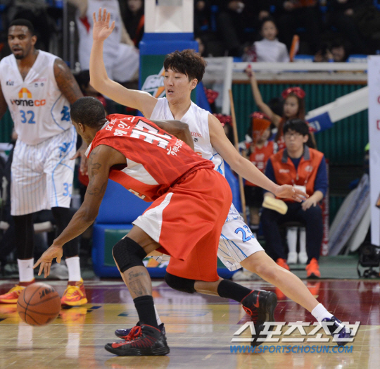| 19일 오후 서울 잠실학생체육관에서 2013-2014 프로농구 전주 KCC와 서울 SK의 경기가 열렸다. KCC 김민구가 SK 헤인즈를 밀착 마크하고 있다. 잠실학생체=김경민 기자 kyungmin@sportschosun.com / 2014.01.19. |