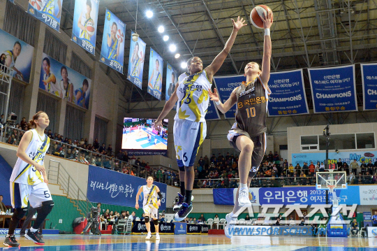 ◇26일 안산와동실내체육관서 열린 '우리은행 2013~14시즌 여자 프로농구' 신한은행-KB스타즈전에서 KB 변연하(오른쪽)가 신한은행 비어드의 마크를 뚫고 골밑슛을 시도하고 있다. 사진제공=WKBL