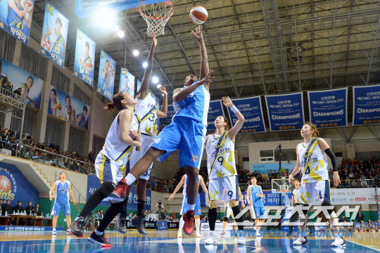 ◇지난 18일 안산와동실내체육관서 열린 '우리은행 2013~14시즌 여자 프로농구' 신한은행과 우리은행의 경기에서 우리은행 사샤 굿렛(가운데)이 신한은행 선수들의 마크를 뚫고 골밑슛을 시도하고 있다. 사진제공=WKBL