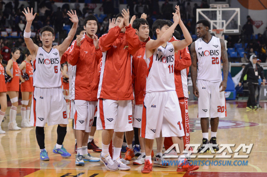 30일 오후 서울 잠실학생체육관에서 2013-2014 프로농구 SK와 모비스의 경기가 열렸다. SK를 97대 85로 꺽고 단독 선두에 올라선 모비스 선수들이 환호하고 있다. 잠실학생체=김경민 기자 kyungmin@sportschosun.com / 2014.01.30.