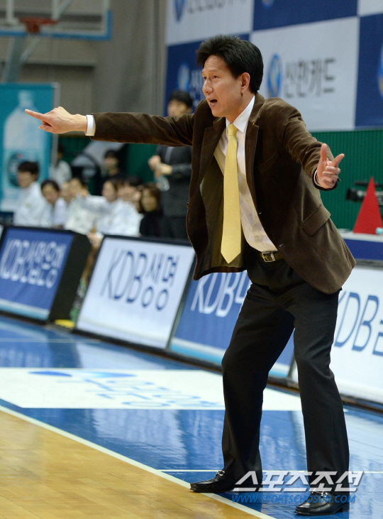요즘 여자농구에서 가장 '핫(뜨거운)'한 팀은 KB스타즈다. 그들은 8일 현재 4연승을 달렸다. 14승10패. 3강 플레이오프 안정권이다. 2위 신한은행을 뒤를 바짝 추격했다. 4위 삼성생명과의 격차는 4.5게임으로 벌어져 있다. 무엇보다 놀라운 건 시즌 막판 KB스타즈의 뛰어난 경기력이다. 공수 밸런스가 완벽하게 맞아들어가고 있다. 특히 지난 7일 최강으로 평가받는 우리은행을 71대60으로 완파했다. 강한 압박 수비와 내외곽의 균형잡힌 득점은 무척 인상적이었다. KB스타즈가 플레이오프에서 돌풍을 일으킬 수 있다는 걸 보여주었다. 신한은행과 우리은행이 바짝 긴장하게 만들었다. 이런 KB스타즈 변화의 중심에 서동철 감독이 있다. 26일 안산 와동실내체육관에서 여자프로농구 신한은행과 KB국민은행의 경기가 열렸다. KB 서동철 감독이 선수들에게 작전을 전달하고 있다. 안산=송정헌 기자 songs@sportschosun.com/2014.01.26 |