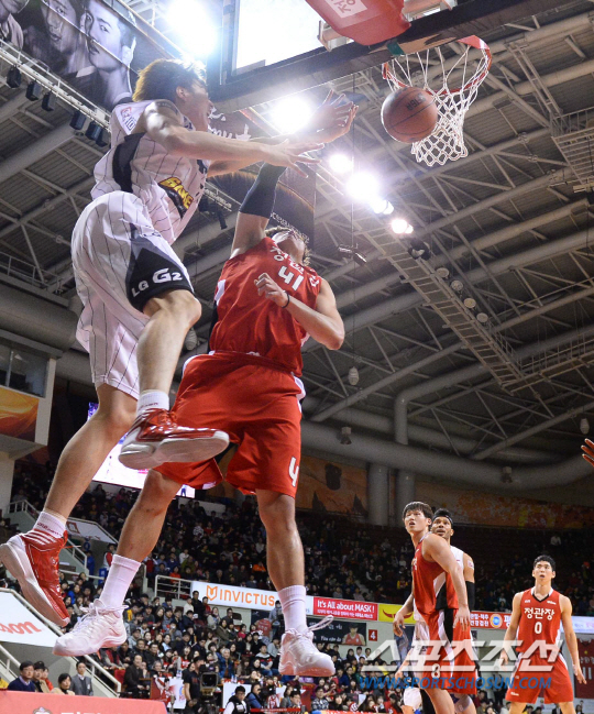 2013-2014 프로농구 안양인삼공사와 창원LG의 경기가 9일 안양실내체육관에서 열렸다. LG 김종규가 인삼공사 오세근의 수비사이로 레이업 슛을 쏘고있다. 안양=최문영 기자 deer@sportschosun.com /2014.02.09/