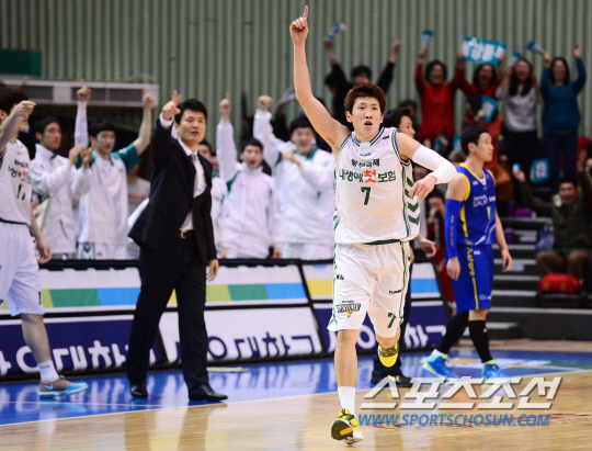 최근 사령탑이 바뀐 두 팀 서울 삼성과 원주 동부의 경기가 9일 잠실실내체육관에서 열렸다. 경기내 끌려가던 원주동부 두경민이 3쿼터에서 역전 3점슛을 성공 시키고 좋아하고 있다. 잠실=조병관기자 rainmaker@sportschosun.com/2014.02.09/