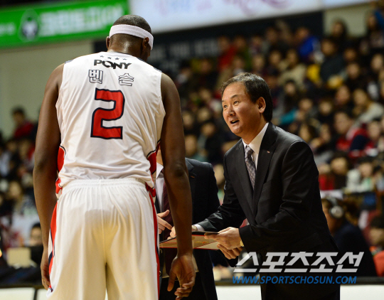 16일 안양실내체육관에서 프로농구 안양KGC와 울산모비스의 경기가 열렸다. 모비스 유재학 감독이 벤슨에게 포지션에 대해 설명하고 있다. 안양=송정헌 기자 songs@sportschosun.com