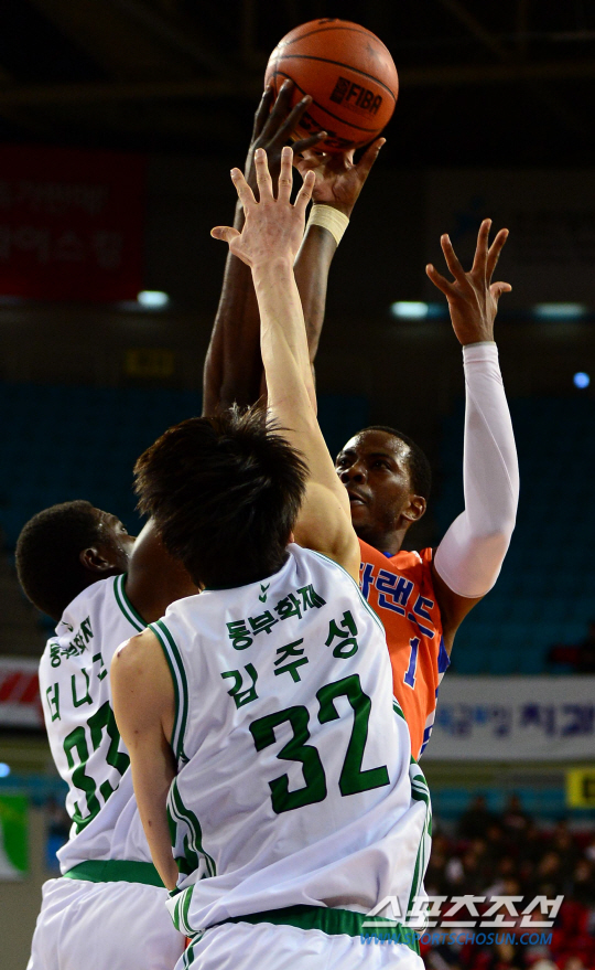 13일 인천 삼산실내체육관에서 프로농구 인천전자랜드와 원주동부의 경기가 열렸다. 전자랜드 로드의 슈팅을 동부 더니건이 블록으로 막아서고 있다. 인천=송정헌 기자 songs@sportschosun.com/2014.02.13 |