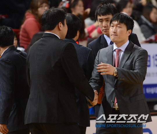 인천 전자랜드와 안양 KGC의 2013-2014 프로농구 경기가 23일 인천삼산체육관에서 열렸다. 69-80으로 패한 KGC 이동남 감독대행이 전자랜드 코치들과 악수를 나누고 있다. 정재근 기자 cjg@sportschosun.com/2014.02.23/