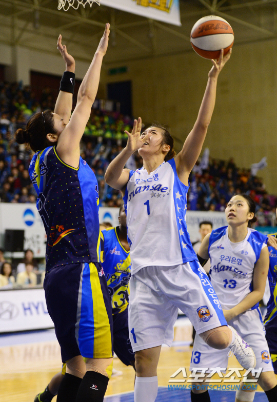 정규리그 우승 확정에 단 1승만을 남겨둔 춘천 우리은행이 2일 춘천 호반체육관에서 안산 신한은행을 불러들여 홈경기를 펼쳤다. 우리은행 양지희가 신한은행 곽주영을 제치며 골밑슛을 시도하고 있다. 춘천=정재근 기자 cjg@sportschosun.com/2014.03.02/