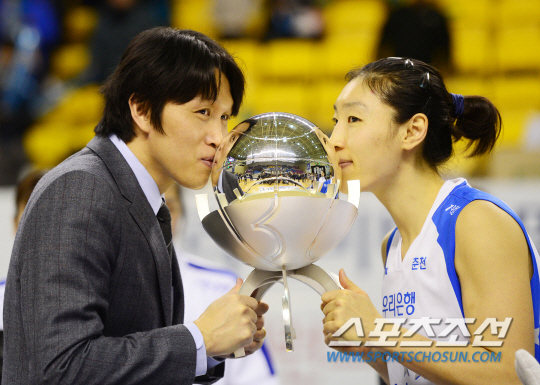 그후 약 1년의 시간이 지났고, 2013~2014시즌이 막바지로 치닫고 있다. 우리은행은 2일 춘천 안방에서 라이벌 신한은행을 꺾고 남은 경기 결과에 상관없이 정규리그 우승, 2연패에 성공했다.