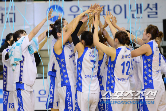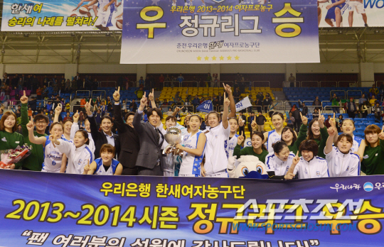 춘천 우리은행이 정규리그 우승을 확정지었다. 2일 춘천 호반체육관에서 열린 안산 신한은행과의 홈 경기에서 우리은행이 84-66으로 신한은행을 꺾고 2013-2014 여자프로농구 정규리그 우승을 달성했다. 경기가 종료되자 우리은행 선수들이 환호하고 있다. 춘천 =정재근기자 cjg@sportschosun.com/2014.03.02/