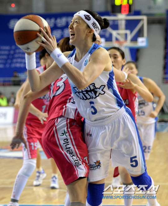 삼성생명과 하나외환의 2013-2014 여자프로농구 경기가 3일 용인실내체육관에서 열렸다. 삼성생명 이미선이 하나외환 김정은의 수비를 피해 레이업을 시도하고 있다. 용인=허상욱 기자 wook@sportschosun.com/2014.03.03/