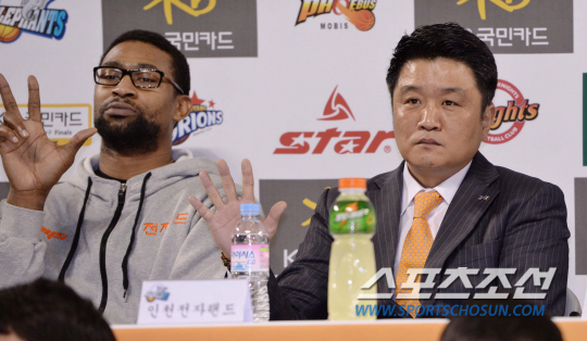 10일 오전 서울 잠실학생체육관에서 2013-2014 프로농구 플레이오프 미디어데이가 열렸다. '2013-2014 프로농구 플레이오프 미디어데이'에는 플레이오프에 진출한 6개 팀 감독 및 대표 선수 두 명이 참석해 우승을 위한 출사표와 각오를 밝힐 예정이며, KBL SNS를 통해 선정된 팬들의 질문에 답변하는 시간도 마련된다. 2013-2014 프로농구 플레이오프는 3월 12일(수) 6강 플레이오프 1차전(전자랜드와 KT)을 시작으로 최종 우승팀을 가린다. 미디어데이에서 전자랜드 유도훈 감독이 플레이오프 6강 예상을 5차전까지 하고 있다. 잠실학생체= 김경민 기자 kyungmin@sportschosun.com / 2014.03.10.