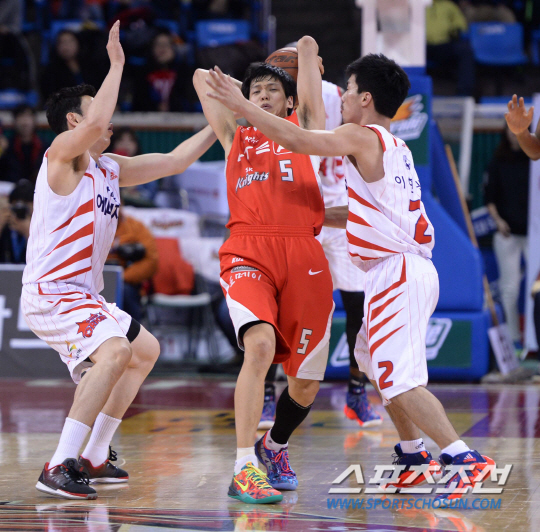 | 13일 오후 서울 잠실학생체육관에서 2013-2014 프로농구 6강 플레이오프 1차전 오리온스와 SK의 경기가 열렸다. SK 김선형(가운데)이 오리온스 김강선(왼쪽)과 이현민 사이에서 패스를 시도하고 있다. 잠실학생체=김경민 기자 kyungmin@sportschosun.com / 2014.03.13. |
