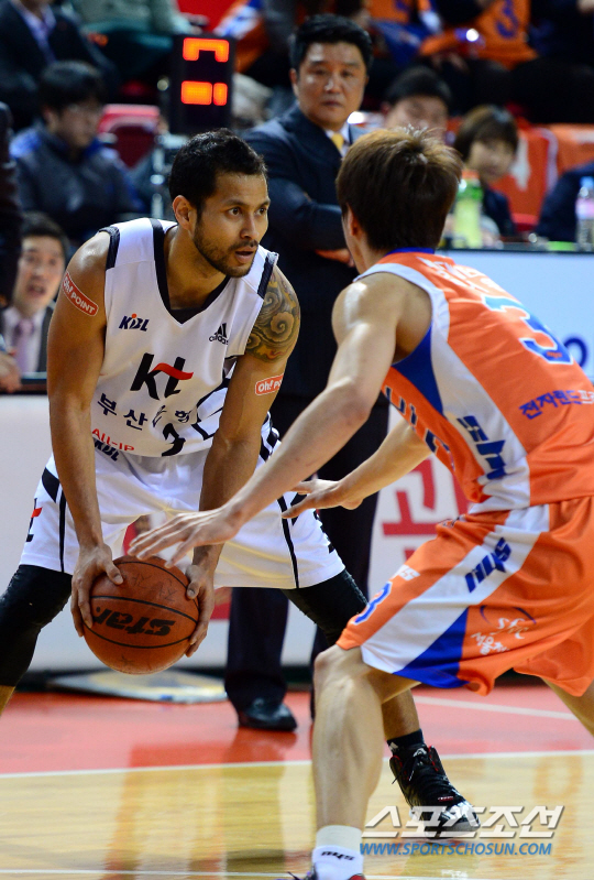 1차전을 내준 남자농구 전자랜드는 2차전에서 준비한 걸 맘껏 보여주고 승리했다. 1승1패. 원점으로 돌렸다. 유도훈 전자랜드 감도은 "오늘은 경기 전 말씀드린 대로 기본적인 디펜스가 잘 이뤄졌다. 1차전에선 상대 클라크와 파틸로에게 다득점 허용했다. 전태풍 조성민에게도 줄 점수를 줬다. 오늘은 수비가 잘 됐다. 리바운드는 계속 숙제인데 그대로 잘 했다. 집중해서 오펜스까지 잘 풀렸다. 조성민과 전태풍 수비도 잘 해줬다"고 말했다. 인천 전자랜드와 부산 KT가 14일 인천삼산체육관에서 프로농구 6강 플레이오프 2차전을 펼쳤다. KT 전태풍이 전자랜드 김지완의 수비를 앞에 두고 돌파를 시도하고 있다. 경기를 지켜보고 있는 유도훈 감독. 인천=송정헌 기자 songs@sportschosun.com