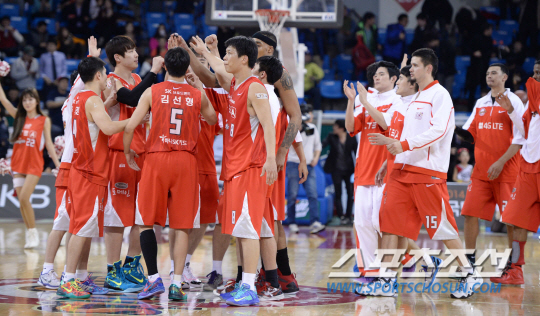 13일 오후 서울 잠실학생체육관에서 2013-2014 프로농구 6강 플레이오프 1차전 오리온스와 SK의 경기가 열렸다. 84대 73으로 1차전을 승리로 이끈 SK 선수들이 하이파이브를 나누고 있다. 잠실학생체=김경민 기자 kyungmin@sportschosun.com / 2014.03.13.