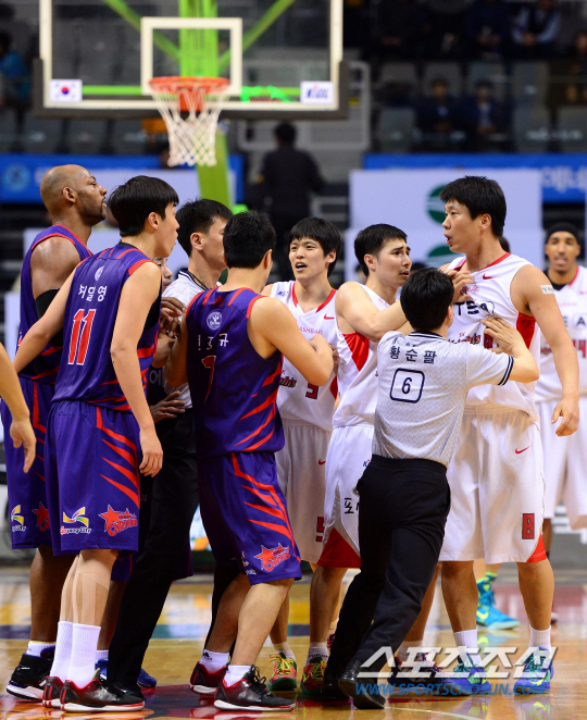 19일 고양체육관에서 프로농구 6강 PO 4차전 서울 SK와 고양 오리온스의 경기가 열렸다. SK가 시리즈 전적 2승 1패로 앞서 있다. 3쿼터 7분여를 남기고 SK와 오리온스 선수들이 감정 싸움을 펼쳤다. SK 박상오와 오리온스 허일영이 말다툼을 벌이고 있다. 고양=송정헌 기자 songs@sportschosun.com/2014.03.19