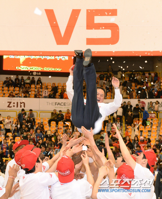 2013-2014 프로농구 챔피언결정전 6차전 창원LG와 울산모비스의 경기가 10일 창원실내체육관에서 열렸다. 모비스 유재학 감독이 챔피언 결정전에서 우승을 차지한후 헹가래를 받고있다. 창원=최문영 기자 deer@sportschosun.com /2014.04.10/ |