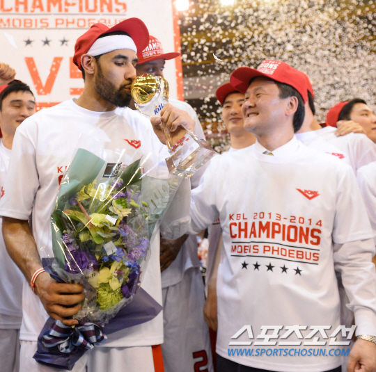 2013-2014 프로농구 챔피언결정전 6차전 창원LG와 울산모비스의 경기가 10일 창원실내체육관에서 열렸다. LG를 물리치고 우승을 차지한 모비스 문태영이 MVP 트로피에 키스를 하고 있다. 창원=최문영 기자 deer@sportschosun.com /2014.04.10/