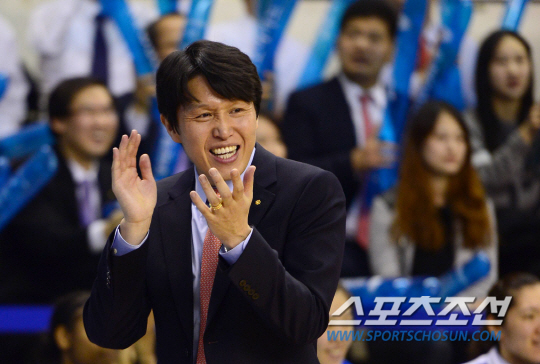 25일 춘천호반체육관에서 여자프로농구 챔피언결정전 1차전 우리은행과 신한은행의 경기가 열렸다. 우리은행이 신한은행에 80대61로 승리했다. 4쿼터 큰 점수 차이로 경기를 앞서가자 위성우 감독이 밝은 표정으로 박수를 치고 있다. 춘천=송정헌 기자 songs@sportschosun.com