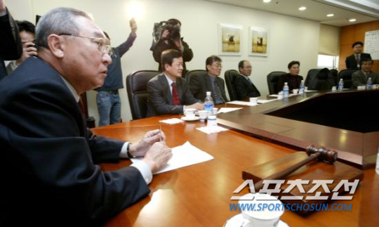 | 김영기 KBL 신임 총재는 지난 2002년부터 2004년까지 제3대 총재로 일한 바 있다. 2003년 12월 KBL 이사회를 주재하고 있는 김 총재. 스포츠조선 DB |