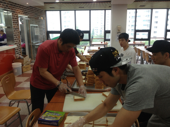 전자랜드 선수단은 2일 인천 부평규에 위치한 부평구 노인 복지관을 찾아 점심식사 준비 및 시설 정리 활동을 진행했다. 지난주 결식 아동들을 위한 도시락 배달에 이은 홈 지역 시민들을 위한 두 번째 봉사활동.