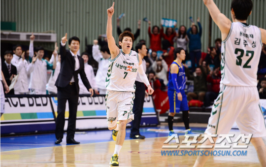 최근 사령탑이 바뀐 두 팀 서울 삼성과 원주 동부의 경기가 9일 잠실실내체육관에서 열렸다. 경기내 끌려가던 원주동부 두경민이 3쿼터에서 역전 3점슛을 성공 시키고 좋아하고 있다. 잠실=조병관기자 rainmaker@sportschosun.com