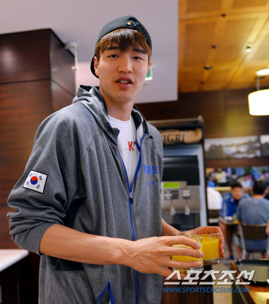 2014 인천아시안게임과 스페인 세계농구선수권을 준비하기위해 뉴질랜드에서 평가전을 치르며 전지훈련을 하고 있는 남자농구팀 대표팀이 3일째 훈련에 접어들었다. 15일 뉴질랜드 대표팀과의 친선경기에 앞서 김종규가 이른 저녁을 먹고 있다. 어깨 태극마크가 눈길을 끈다.