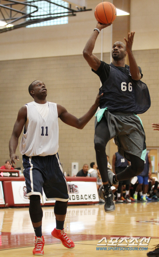 2014 KBL 트라이아웃이 21일 오후(현지 시간) 라스베이거스 데저트 오아시스 고등학교에서 진행됐다. 리차드슨(오른쪽)이 카일리 마샬을 따돌리고 미들슛을 시도하고 있다.