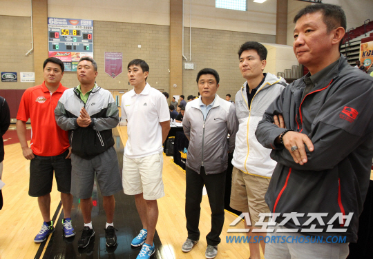 2014 KBL 트라이아웃이 21일 오후(현지 시간) 라스베이거스 데저트 오아시스 고등학교에서 진행됐다. 각 구단 감독들이 트라이아웃에 앞서 사무총장으로부터 공지사항을 듣고 있다. 오른쪽부터 허재, 김영만, 유도훈, 이상민, 전창진, 문경은 감독.