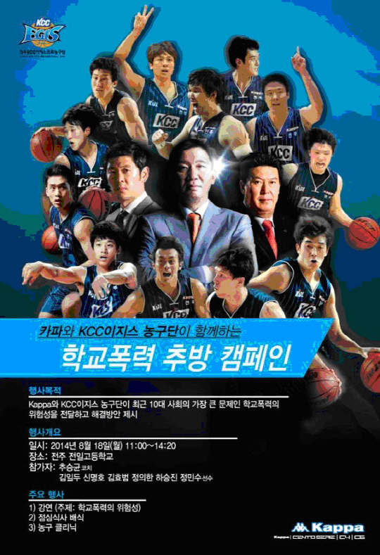 KCC과 카파코리아가 공동 기획한 이번 행사는 총 세시간으로 구성된다. KCC는 첫 번째 시간을 통해 학교폭력의 위험성에 대해 강연할 계획이다. 선수단은 이번 강연을 통해 학교 폭력을 뿌리뽑기 위해 우리 모두가 동참해야 한다는 메시지를 전달할 계획이다.