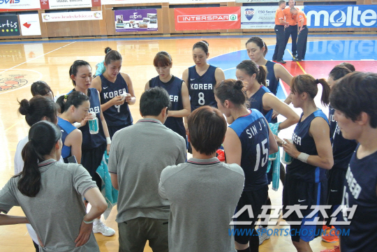 25일(한국시각) 체코 흐라데크 크랄로베에서 열린 소콜 HK와의 연습경기에서 위성우 감독에게 작전 지시를 받고 있는 여자농구대표팀 선수들. 흐라데크 크랄로베(체코)=이명노 기자 nirvana@sportschosun.com