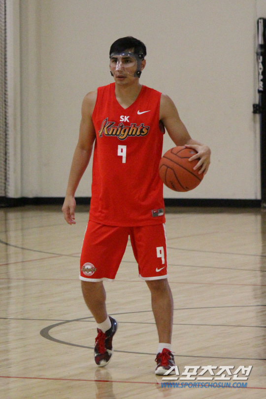 SK 주희정이 코뼈 부상으로 안면 보호 마스크를 쓰고 훈련에 임하고 있다. 어바인(미국 캘리포니아주)=권인하 기자 indyk@sportschosun.com