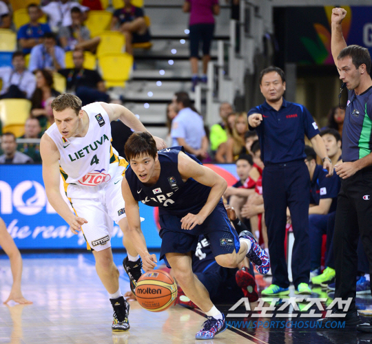남자농구대표팀이 9월 4일(한국시간) 스페인 그란카나리아 라스팔마스의 그란카나리아 아레나에서 2014 FIBA(국제농구연맹)농구월드컵 조별리그 D조 4차전 리투아니아와 경기를 펼쳤다. 한국은 3연패를 기록중이다. 김선형이 리투아니아 마티나스의 파울에도 돌파를 시도하고 있다. <그란카나리아(스페인)=사진공동취재단/스포츠조선 송정헌 기자>