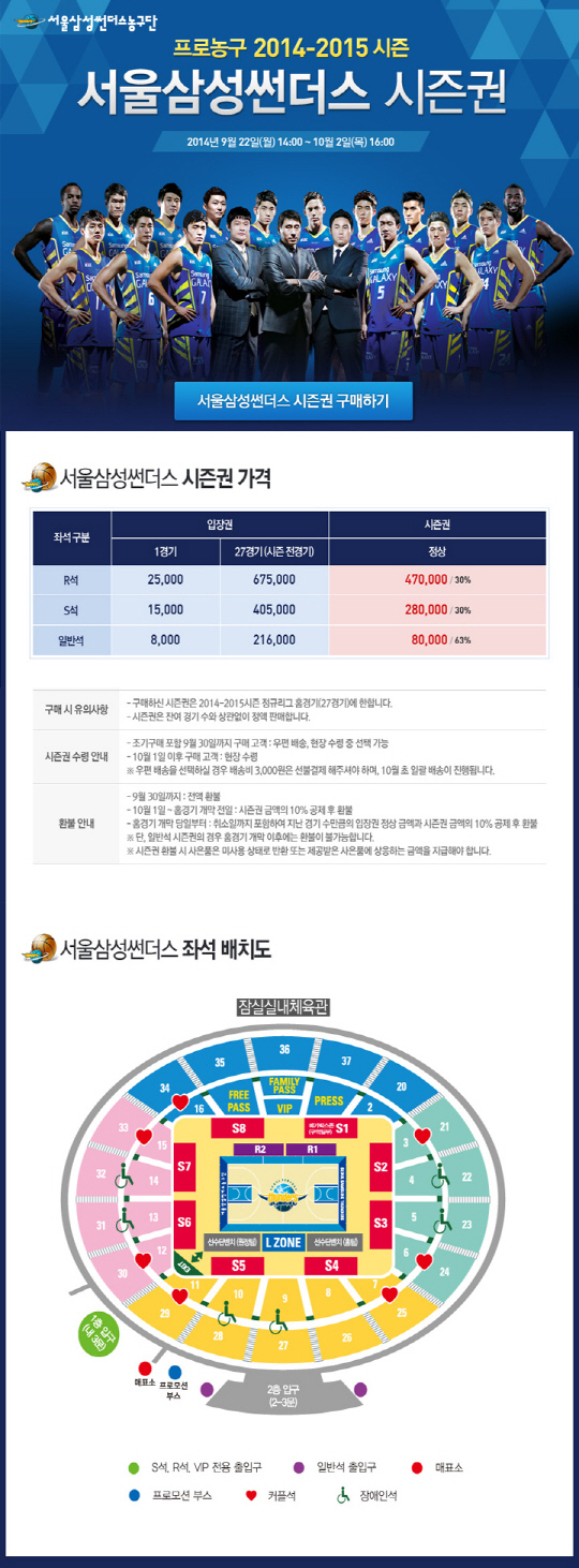 남자농구 삼성 썬더스가 오는 10월 2일 오후4시까지 2014~2015시즌 시즌권을 판매한다.