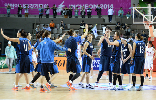 일본과의 준결승전에서 승리한 뒤 기쁨을 나누고 있는 한국 선수들. 사진제공=WKBL