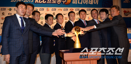 2014-2015 프로농구 미디어데이가 6일 서울 소공동 더플라자호텔 그랜드볼룸에서 열렸다. 10개 구단 감독이 우승트로피와 함께 포즈를 취하고 있다. 2014-2015 프로농구는 오는 10월 11일 지난 시즌 챔피언 울산 모비스와 준우승팀 창원 LG의 공식 개막전을 시작으로 6개월간의 대장정에 돌입한다. 이번 시즌에는 이전 시즌과 달리 월요일 경기가 신설됐다. 허상욱 기자 wook@sportschosun.com/2014.10.06/