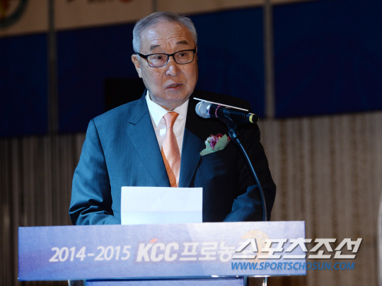 2014-2015 프로농구 타이틀스폰서 조인식이 6일 서울 소공동 더플라자호텔 그랜드볼룸에서 열렸다. KBL 김영기 총재가 인사말을 하고 있다. 올 시즌 프로농구 공식 대회명은 '2014-2015 KCC 프로농구'다. KBL과 KCC는 국내 프로농구 발전과 흥행을 위해 다양한 프로모션을 공동으로 진행할 예정이다. 허상욱 기자 wook@sportschosun.com