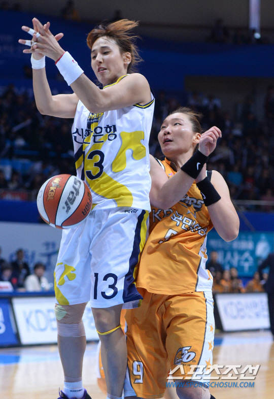 2014-2015 여자프로농구 신한은행과 KB스타즈의 경기가 17일 인천도원체육관에서 열렸다. 신한은행 김단비가 KB스타즈 정미란과 치열하게 리바운드 볼을 다투고 있다. 인천=최문영 기자 deer@sportschosun.com /2014.11.17/