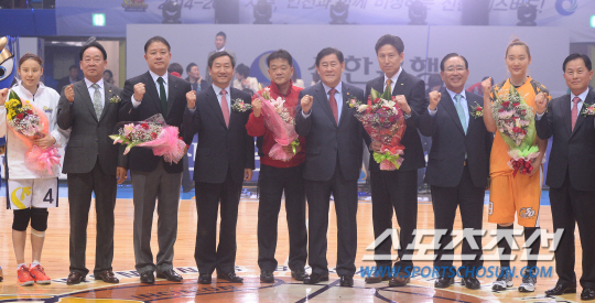 2014-2015 여자프로농구 신한은행과 KB스타즈의 경기가 17일 인천도원체육관에서 열렸다. 경기전 유정복 인천광역시장, WKBL 최경환 총재, 정인교 신한은행 감독, 서동철 KB스타즈 감독이 파이팅을 외치며 포즈를 취하고 있. 인천=최문영 기자 deer@sportschosun.com /2014.11.17/ |