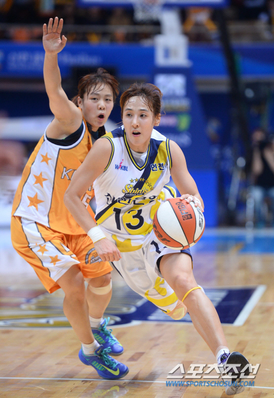 2014-2015 여자프로농구 신한은행과 KB스타즈의 경기가 17일 인천도원체육관에서 열렸다. 신한은행 김단비가 KB스타즈 심성영의 수비사이로 돌파를 시도하고 있다. 인천=최문영 기자 deer@sportschosun.com /2014.11.17/ |