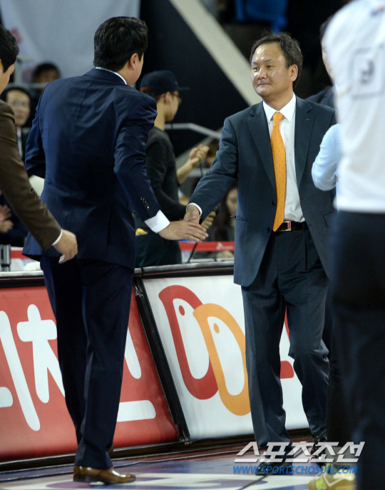 SK와 모비스의 2014-2015 프로농구 경기가 20일 잠실학생체육관에서 열렸다. SK가 77대68로 승리하며 모비스의 12연승을 저지했다. 경기 종료 후 모비스 유재학 감독이 SK 문경은 감독과 악수를 나누고 있다. 잠실학생=허상욱 기자 wook@sportschosun.com