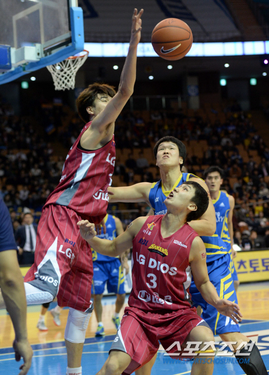 서울 삼성과 창원 LG의 2014-2015 프로농구가 24일 잠실실내체육관에서 열렸다. LG 김종규가 공을 살려내기 위해 쳐내고 있다. 잠실실내=허상욱 기자 wook@sportschosun.com/2014.11.24/ |