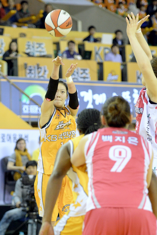 KB스타즈가 27일 청주실내체육관에서 벌어진 2014~2015시즌 KB국민은행 여자농구 2라운드 경기에서 하나외환을 64대49로 눌렀다.