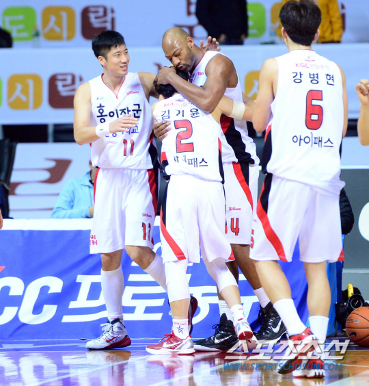 3일 오후 경기도 고양종합체육관에서 2014-2015 프로농구 KGC와 오리온스의 경기가 열렸다. 4쿼터 종료 직전 추가 자유투를 얻어낸 KGC 윌리암스가 김기윤을 끌어 안으며 기뻐하고 있다. 고양=김경민 기자 kyungmin@sportschosun.com/2014.12.03.