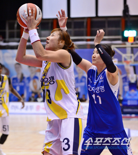 13일 오후 경기도 구리시 구리체육관에서 2014-2015 여자프로농구 신한은행과 KDB의 경기가 열렸다. 신한은행 김단비(왼쪽)가 KDB 이연화의 마크를 넘어 슛을 시도하고 있다. 김경민 기자 kyungmin@sportschosun.com / 2014.11.13.