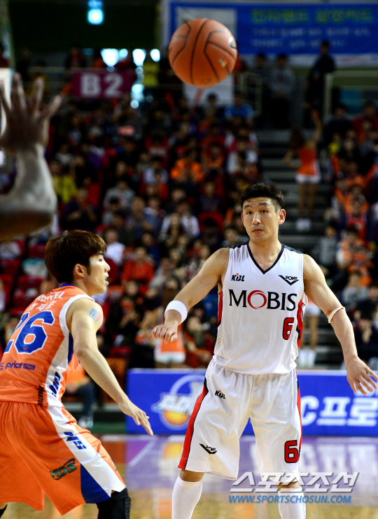 인천 전자랜드와 울산 모비스의 2014-2015 프로농구 경기가 2일 인천 삼산체육관에서 열렸다. 모비스 양동근이 외곽에서 전자랜드 정재홍을 따돌리며 골밑으로 패스를 하고 있다. 8경기를 치른 전자랜드는 3승 5패로 6위, 9경기를 치른 울산 모비스는 7승 2패로 2위를 달리고 있다. 인천=정재근 기자 cjg@sportschosun.com/2014.11.02/