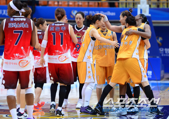 22일 오후 인천 도원체육관에서 2014-2015 여자프로농구 KB 스타즈와 신한은행의 경기가 열렸다. 74대 70으로 신한은행을 꺽은 KB 스타즈 선수들이 기뻐하고 있다. 인천=김경민 기자 kyungmin@sportschosun.com