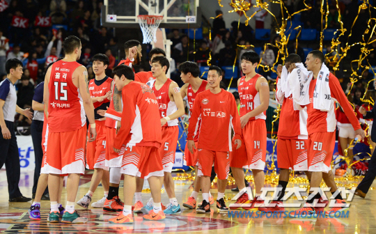 25일 오후 서울 잠실 학생체육관에서 2014-2015 프로농구 서울 삼성과 서울 SK의 경기가 열렸다. 삼성에 승리한 SK 선수들이 코트 위에서 하이파이브를 나누고 있다. 잠실학생체= 김경민 기자 kyungmin@sportschosun.com / 2014.12.25. |