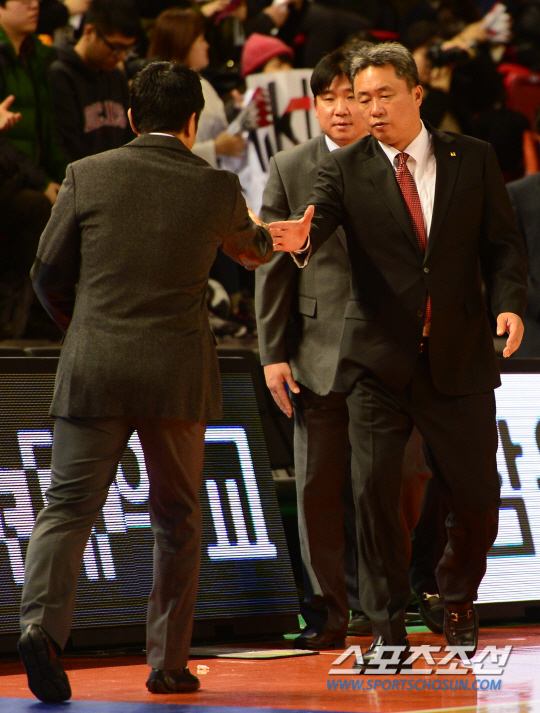 28일 인천 삼산체육관에서 프로농구 인천전자랜드와 부산KT의 경기가 열렸다. KT가 전자랜드에 승리하며 전자랜드 전 3연패를 탈출했다 경기 종료 후 악수를 나누고 있는 KT 전창진 감독과 전자래드 유도훈 감독(왼쪽). 인천=송정헌 기자 songs@sportschosun.com/2014.12.28 |