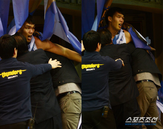 이에 화가난 하승진은 나가다 말고 돌아오는 제스처를 했고, 구단 관계자와 안전요원들이 달려들어 말렸다. 그 과정에서 목재로 만든 설치물이 흔들리기도 하는 일촉즉발의 상황이 되기도 했다.