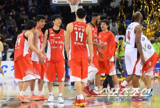 2014-2015 프로농구 서울SK와 안양KGC의 경기가 3일 잠실학생체육관에서 열렸다. SK선수들이 KGC를 상대로 87대 74 승리를 확정지은후 하이파이브 하고 있다. 잠실=최문영 기자 deer@sportschosun.com /2015.01.03/